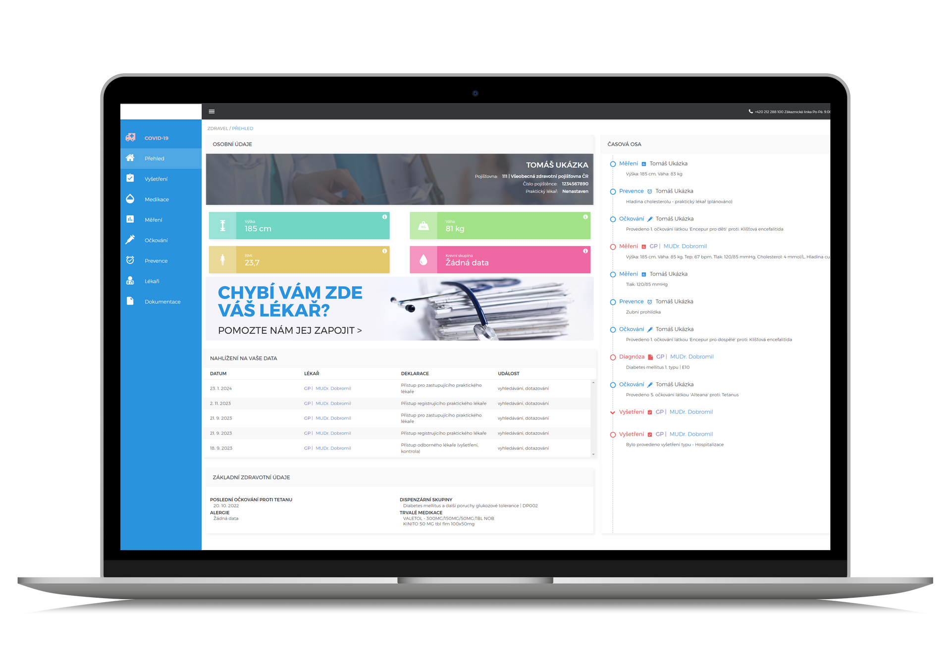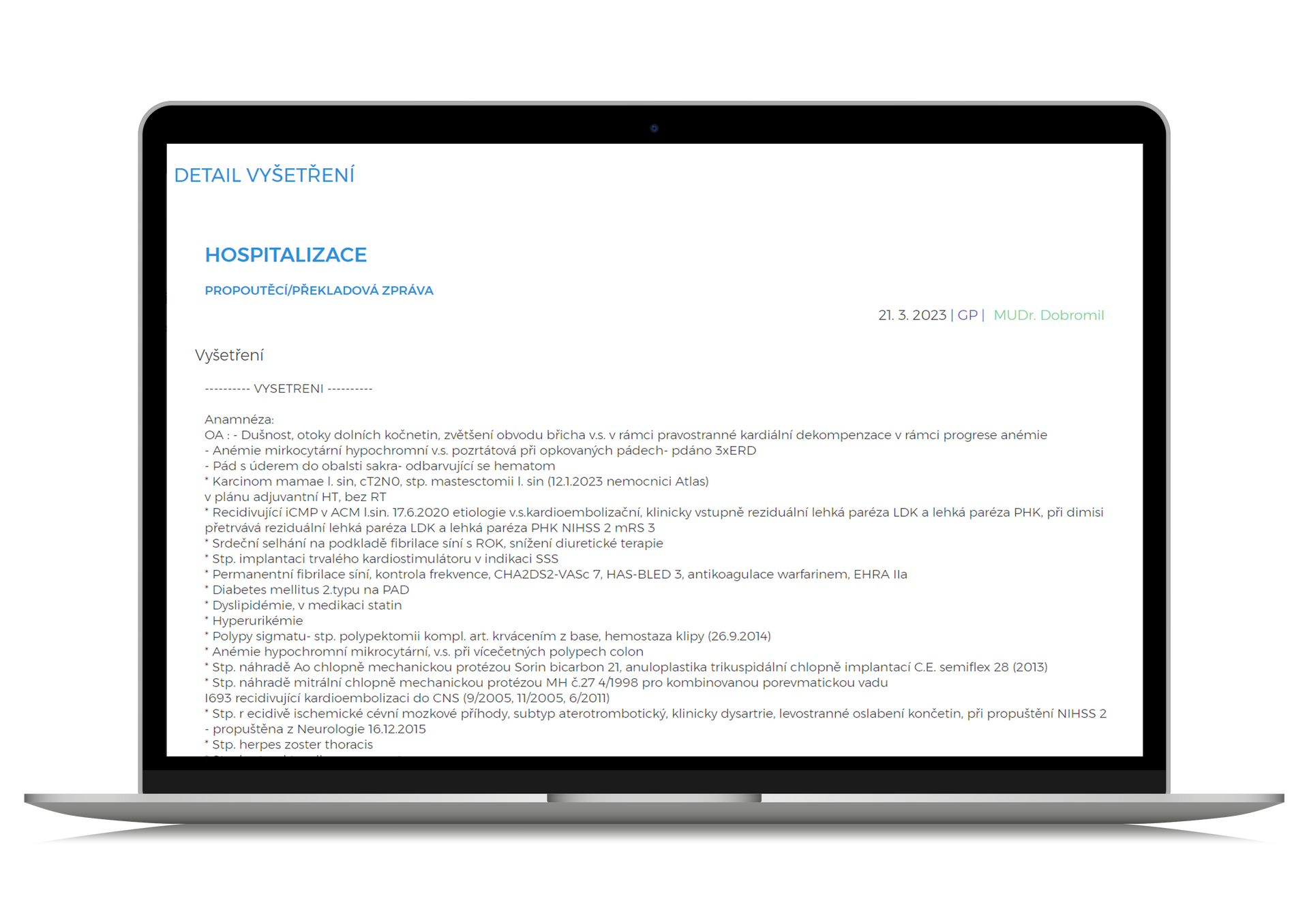 - Kontrola v rukou pacienta: Vy máte plnou kontrolu nad tím, jak se s vašimi informacemi nakládá, s možností sdílet je podle vašeho uvážení.